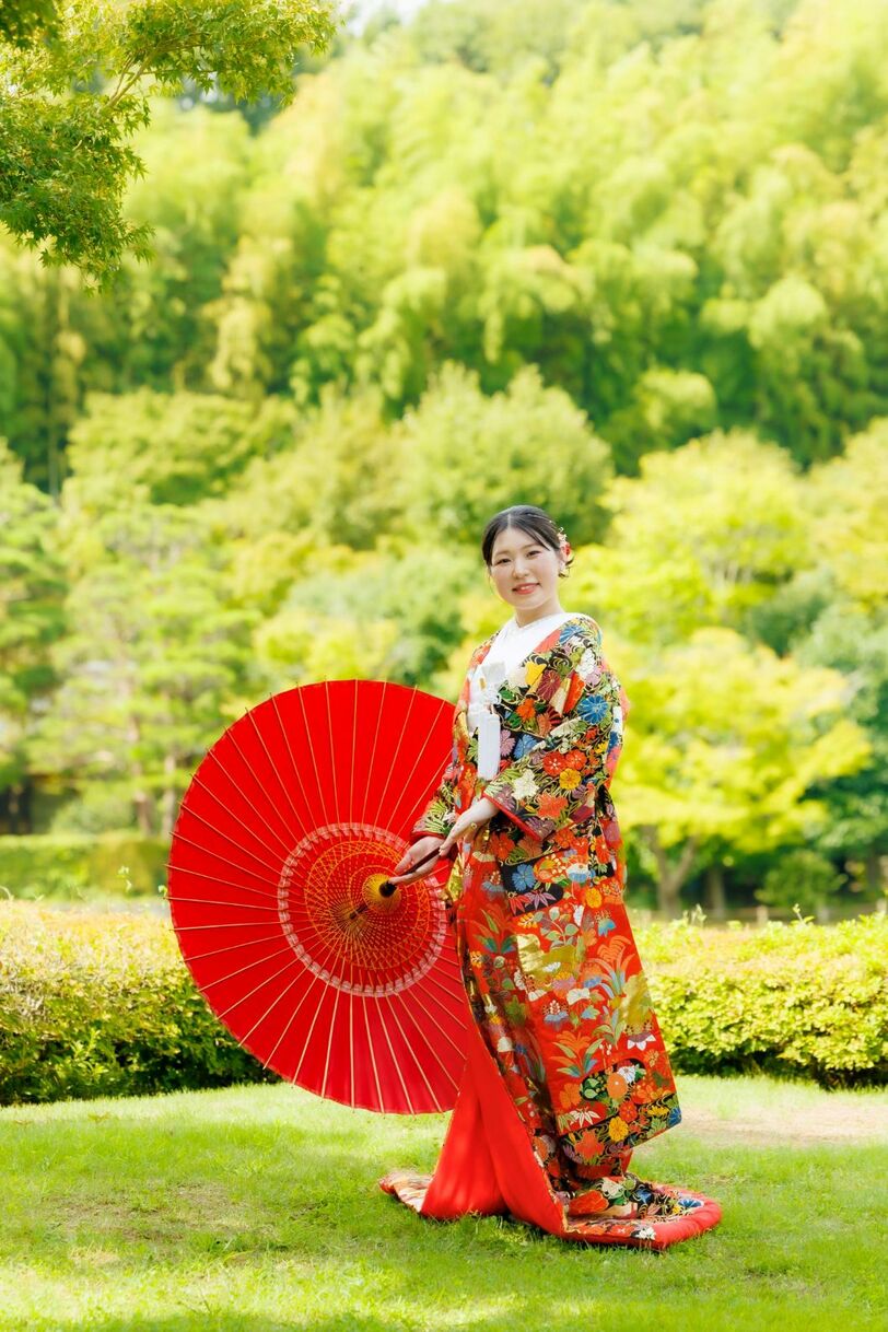 色打掛を着てのロケーションフォトは花々との相性が抜群です。