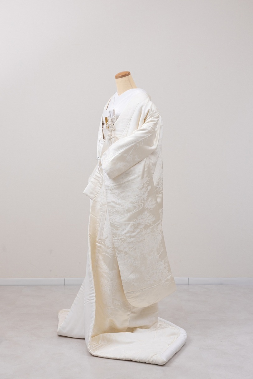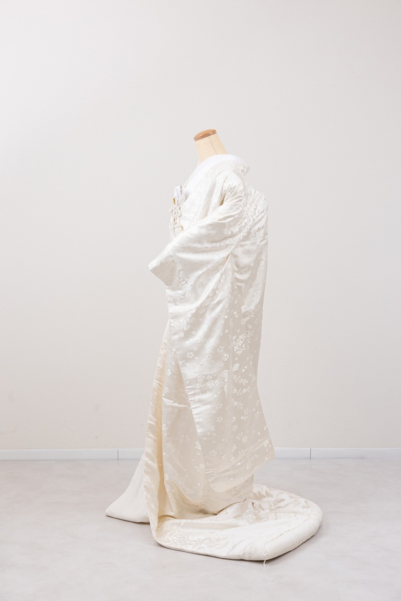 白色より生成り・クリームに近い色味です。光沢感がありスタジオ撮影におすすめ。鶴・孔雀・桜・松など様々な和柄がちりばめられている白無垢