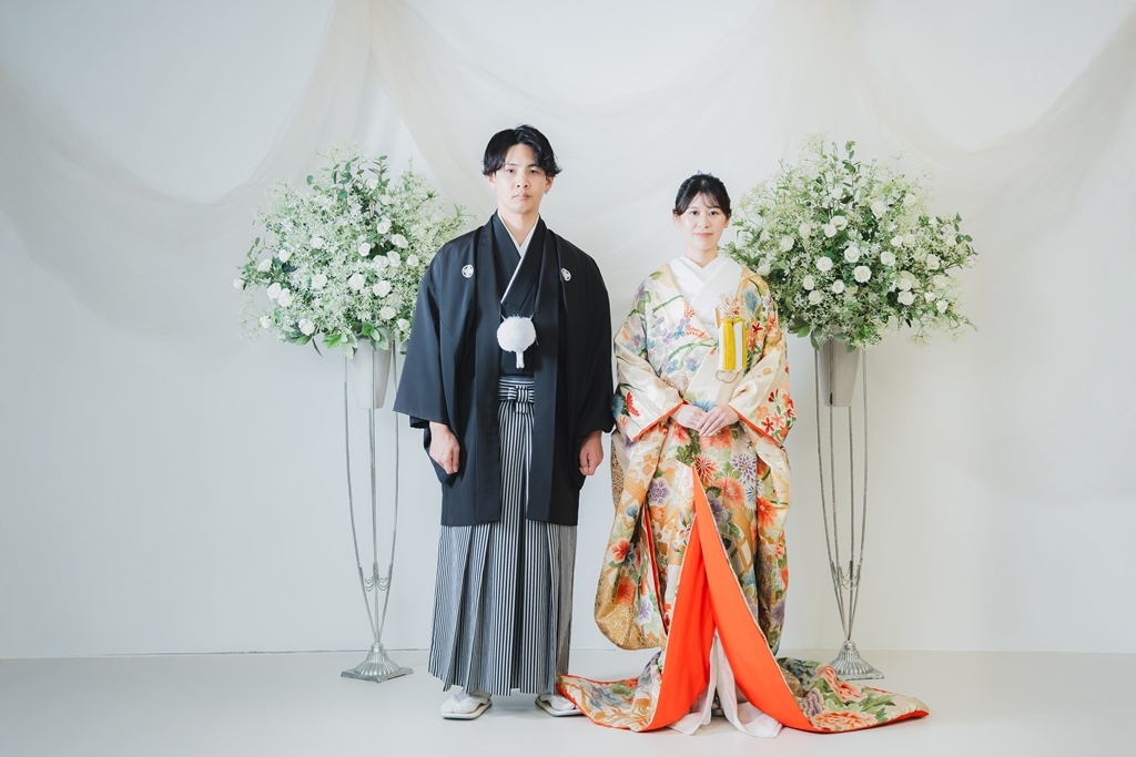 ▲金屛風前で正座の撮影は全プラン共通▲結婚式予定の方は招待状に間に合わせよう