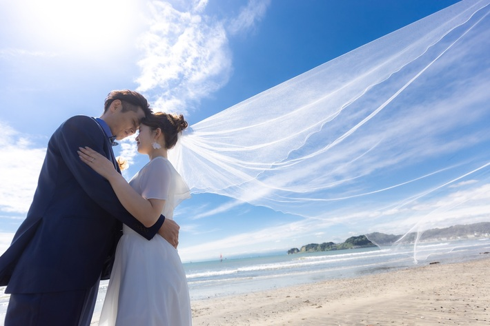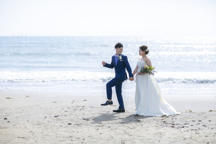 海辺でのフォトウェディングは、自然光と海のきらめきを背景にロマンチックな写真を撮影できます。