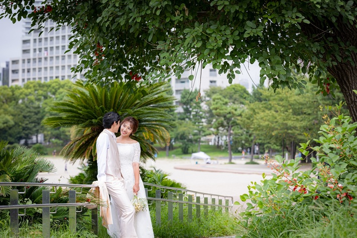 特に新緑の季節に撮影を行うことで、ウェディングドレスの色が緑に映える特別な一枚に仕上がります。