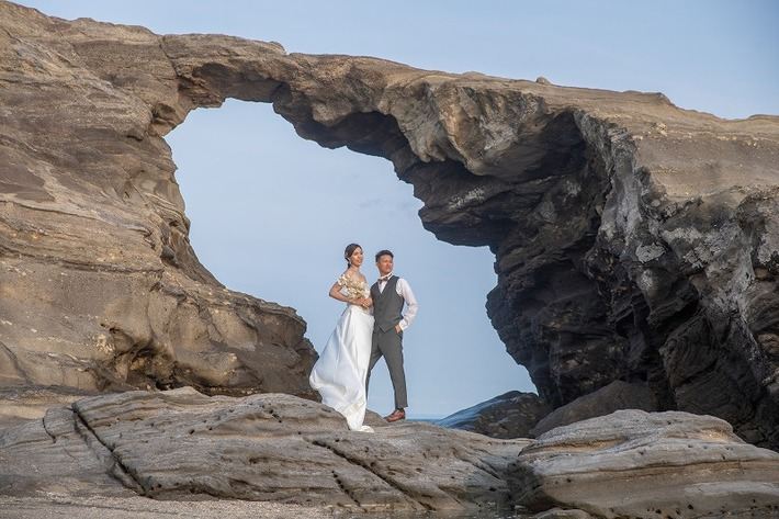新郎新婦が手を取り合う姿や、岩に座って海を見つめる姿など、冒険心あふれるショットが生まれます。