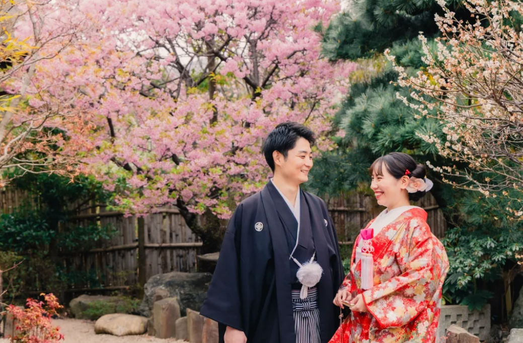 華雅苑では和装・洋装ともに多数の衣装をご用意し、桜を背景とした華やかな前撮りを楽しみたい新郎・新婦様をお待ちしております。