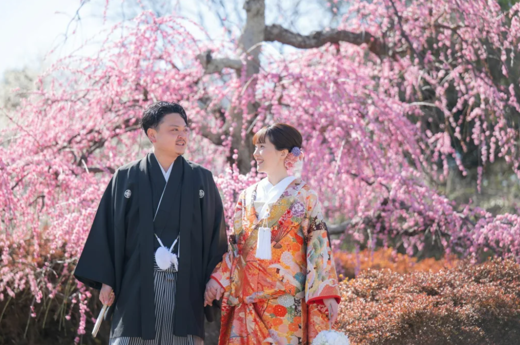 ソメイヨシノなどと比べて約1ヶ月ほど早く撮影できるため、3月・4月に挙式を控えた方でも余裕をもって前撮りを楽しめます。