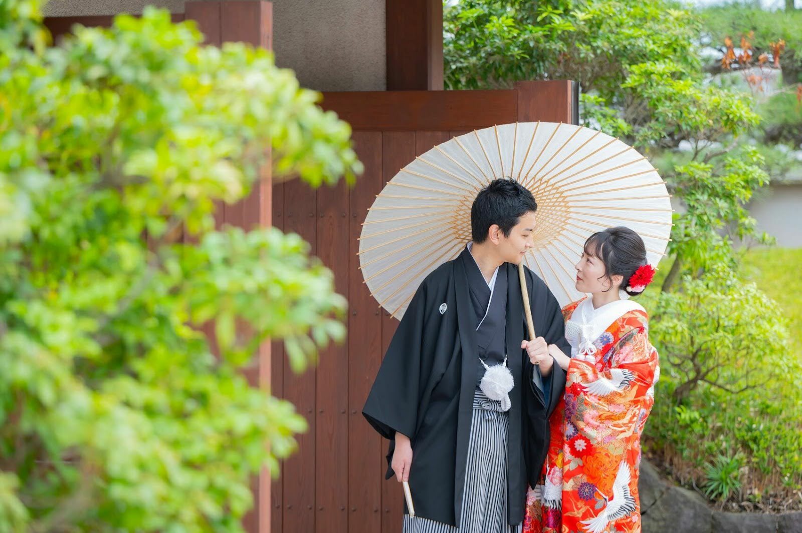 そこに和傘を添えることで、構図にパッとアクセントが加わり、お二人の立ち姿を凛と引き立ててくれます。