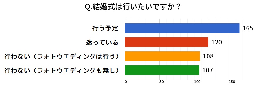 やはり、コロナウイルスの影響で、結婚式への意識は薄れていることがわかります。結婚式はしないけれど、フォトウエディングなどを行い、記念に残ることは行いたい方が多いのですね。
