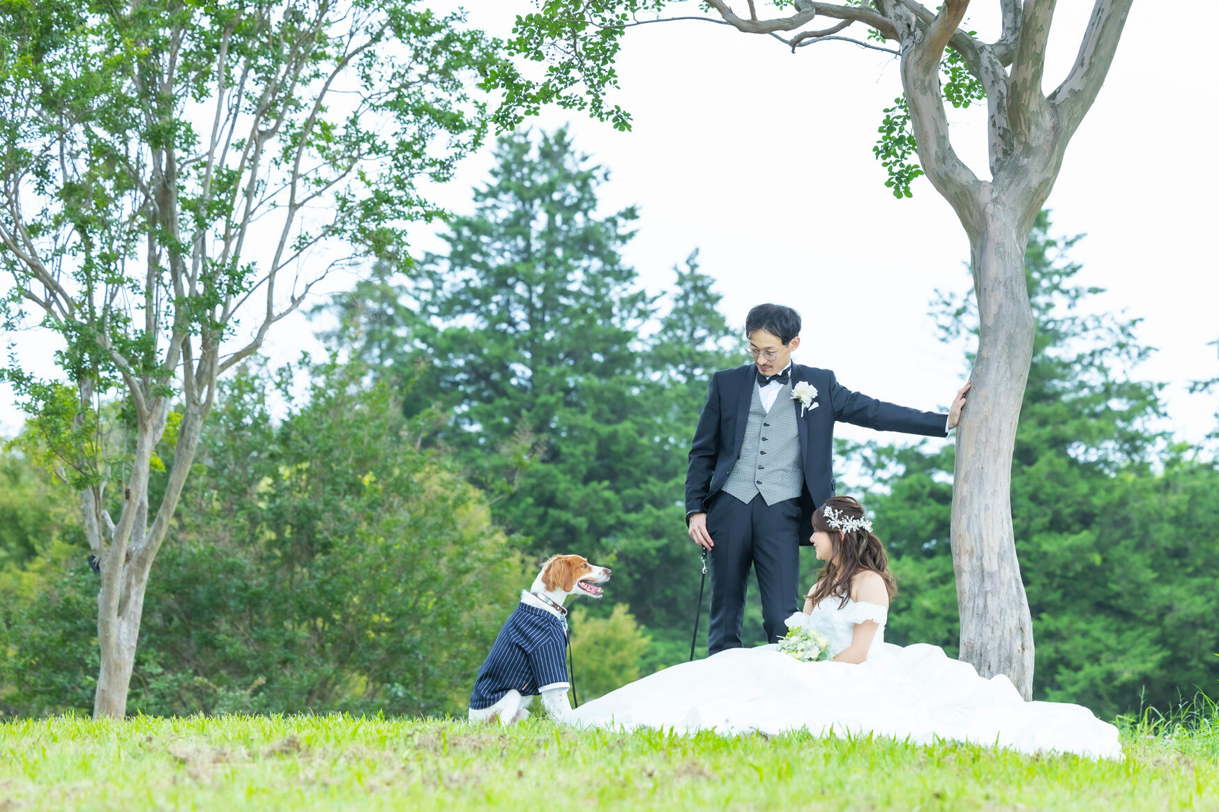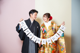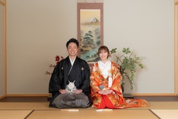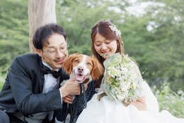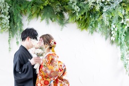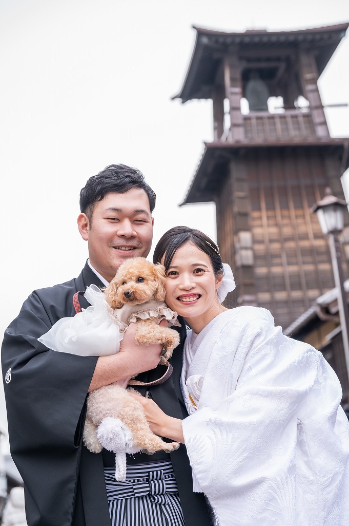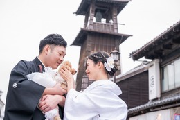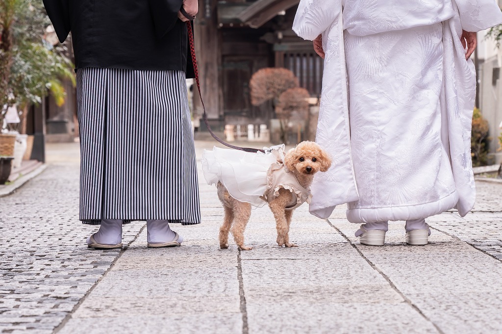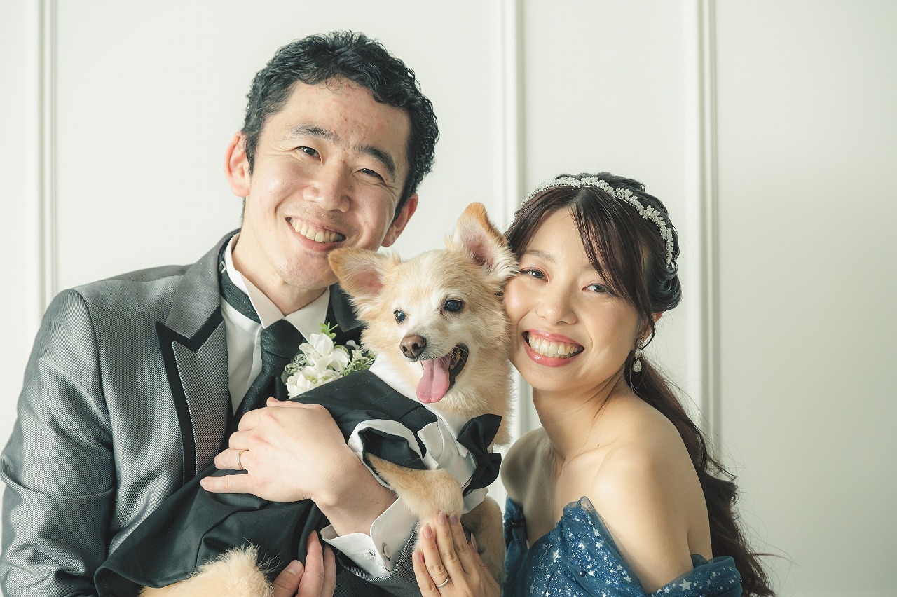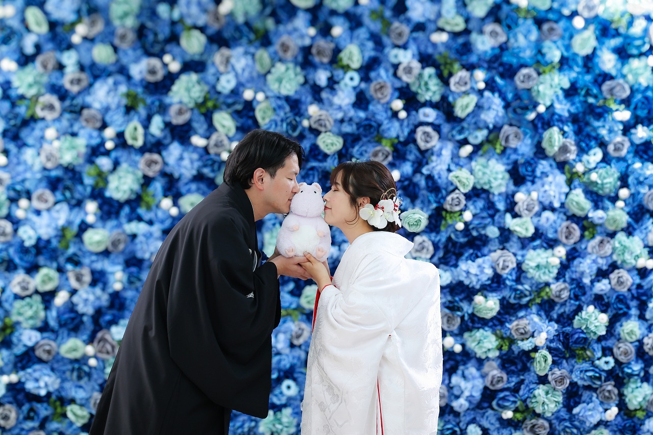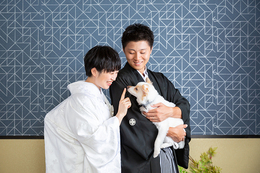 ペットとの撮影も可能。定番の金屏風から装花バックやレンガ調まで。