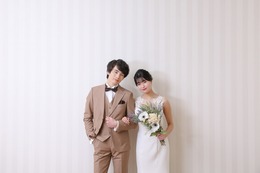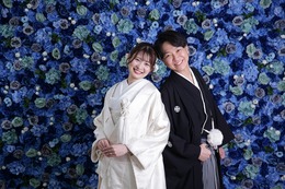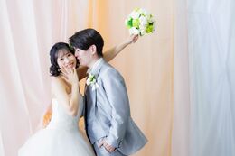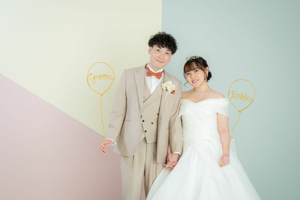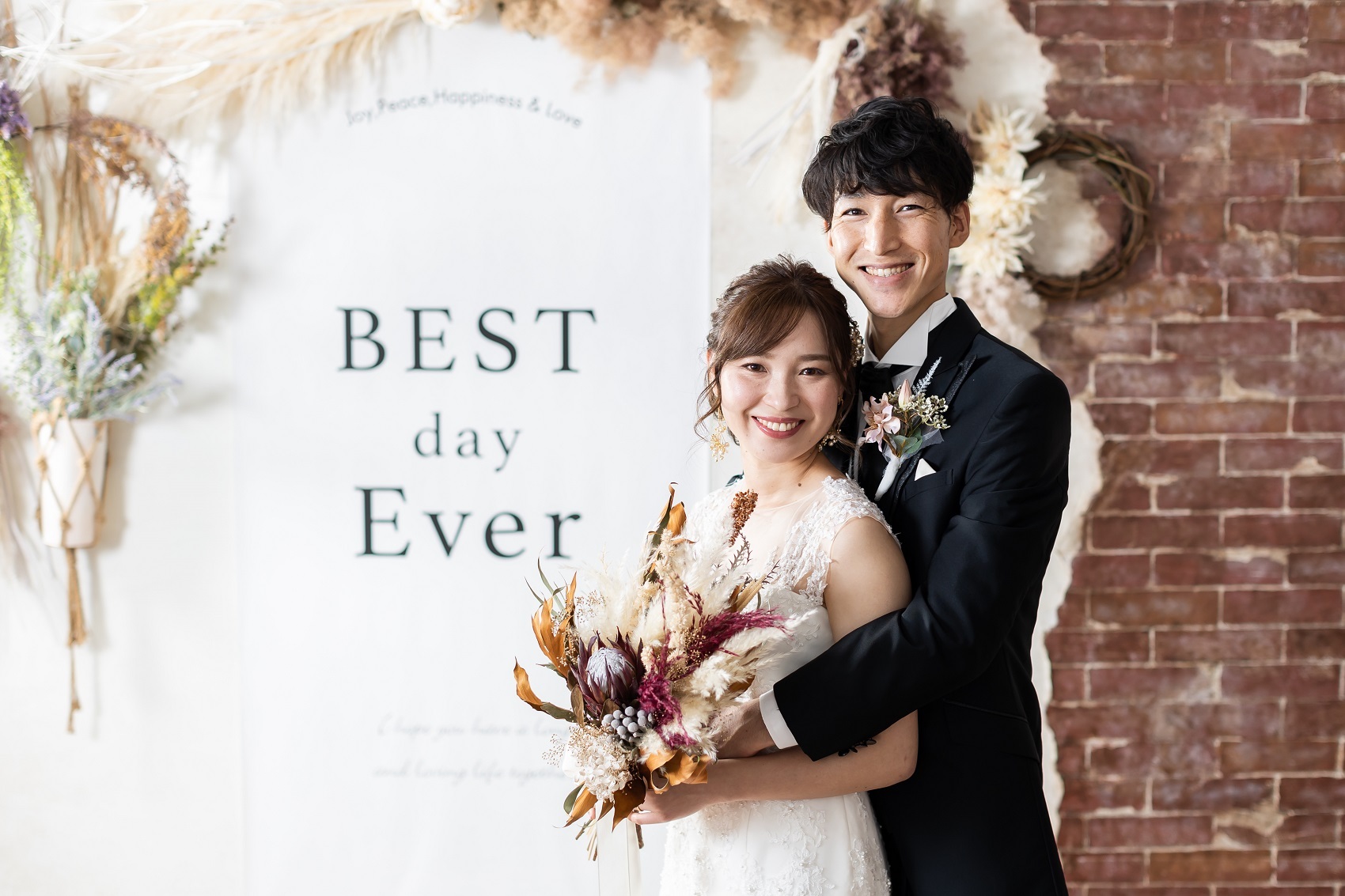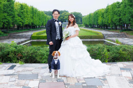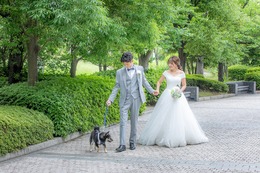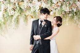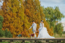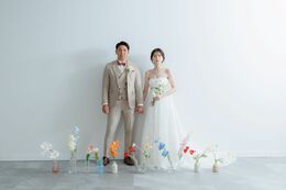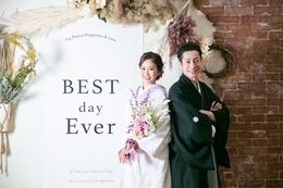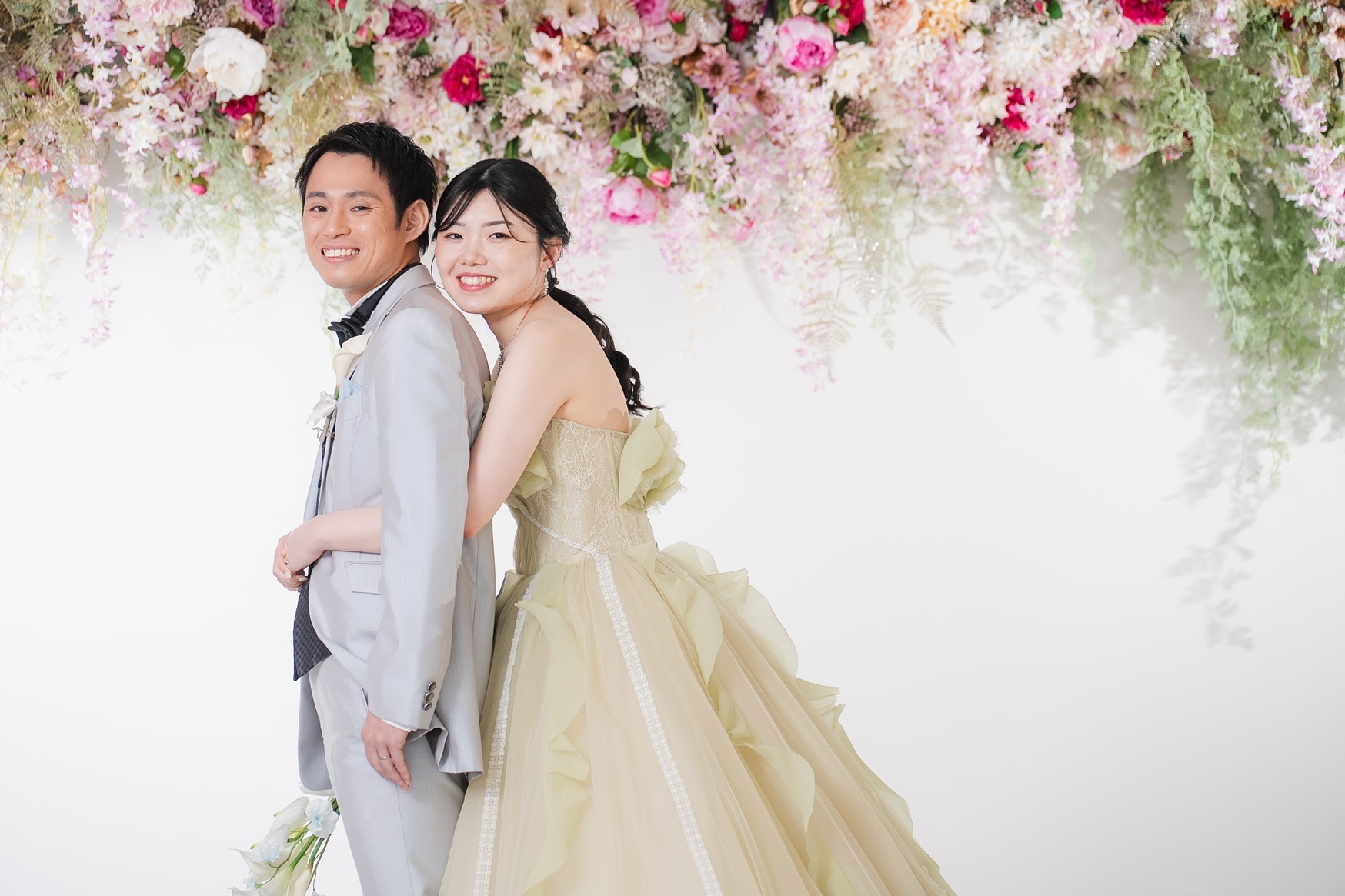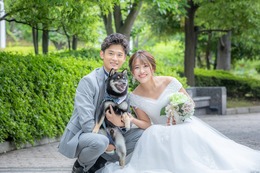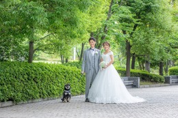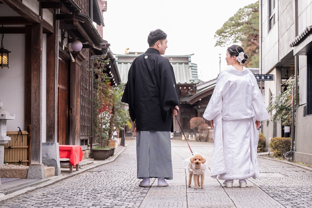 ペットとの撮影も可能。定番の金屏風から装花バックやレンガ調まで。