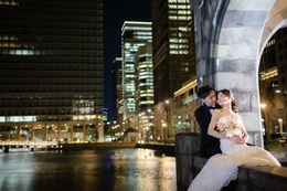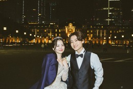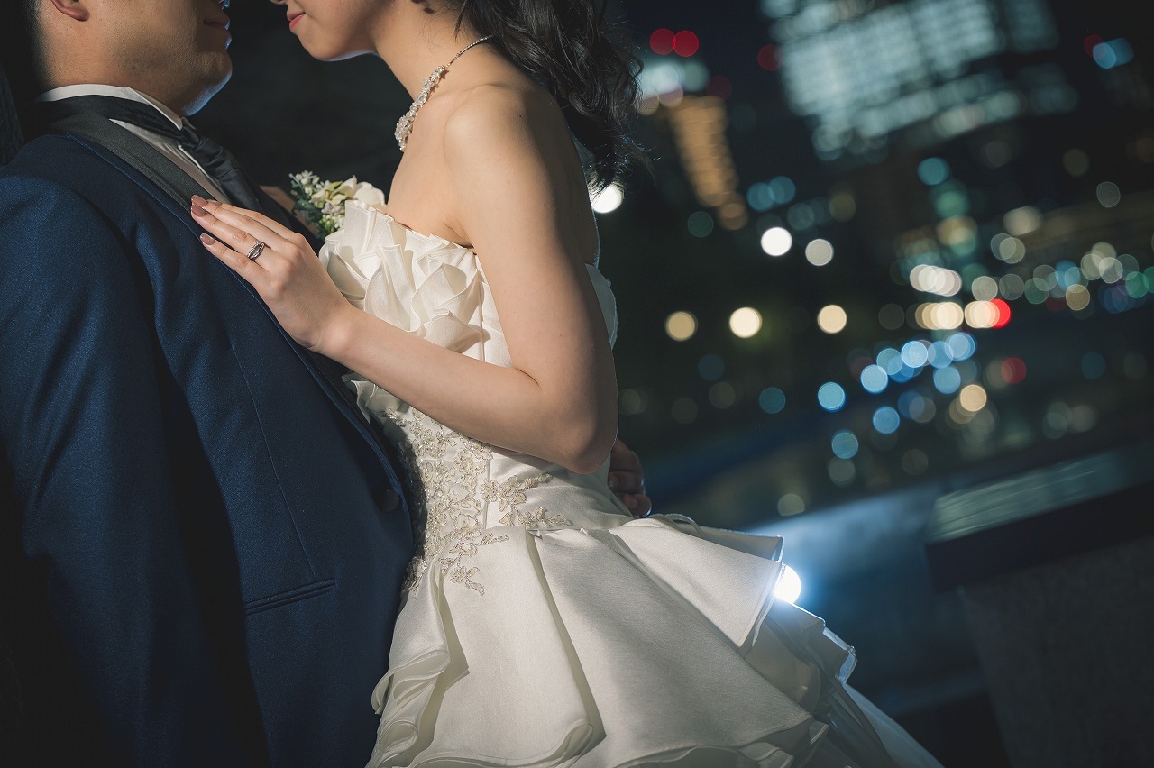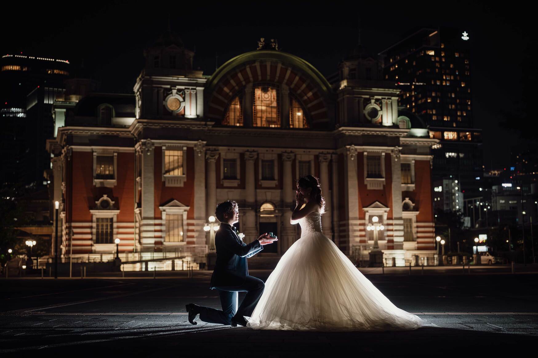夜の幻想的な東京駅の周りでドレス撮影を…