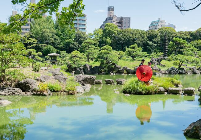 潮入り回遊式庭園として整備された大名庭園の「旧安田庭園」
