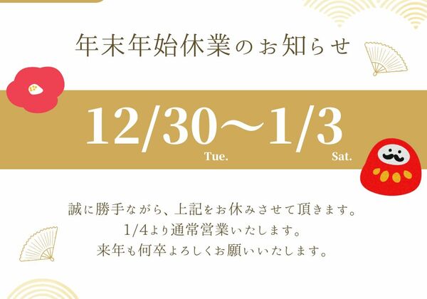 【横浜店】臨時休業のお知らせ 平素は格別のご高配を賜り、厚く御礼申し上げます。誠に勝手ながら、弊社では下記の期間を年末年始休業とさせていただきます。休業期間: 2025年12月30日(火)~2026年1月3日(土)お客様にはご不便とご迷惑をおかけいたしますが、何卒...