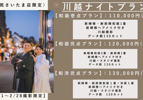 川越ナイトプラン♪ 12/1~2/28撮影限定!【プラン内容】・和装壱点プラン:110,000円(税込) 和装1着 新郎新婦各1着 新郎様 着付け(ヘアセットなし) 新婦様 着付け(ヘアセット・メイクあり) 撮影中アテンド 撮影...