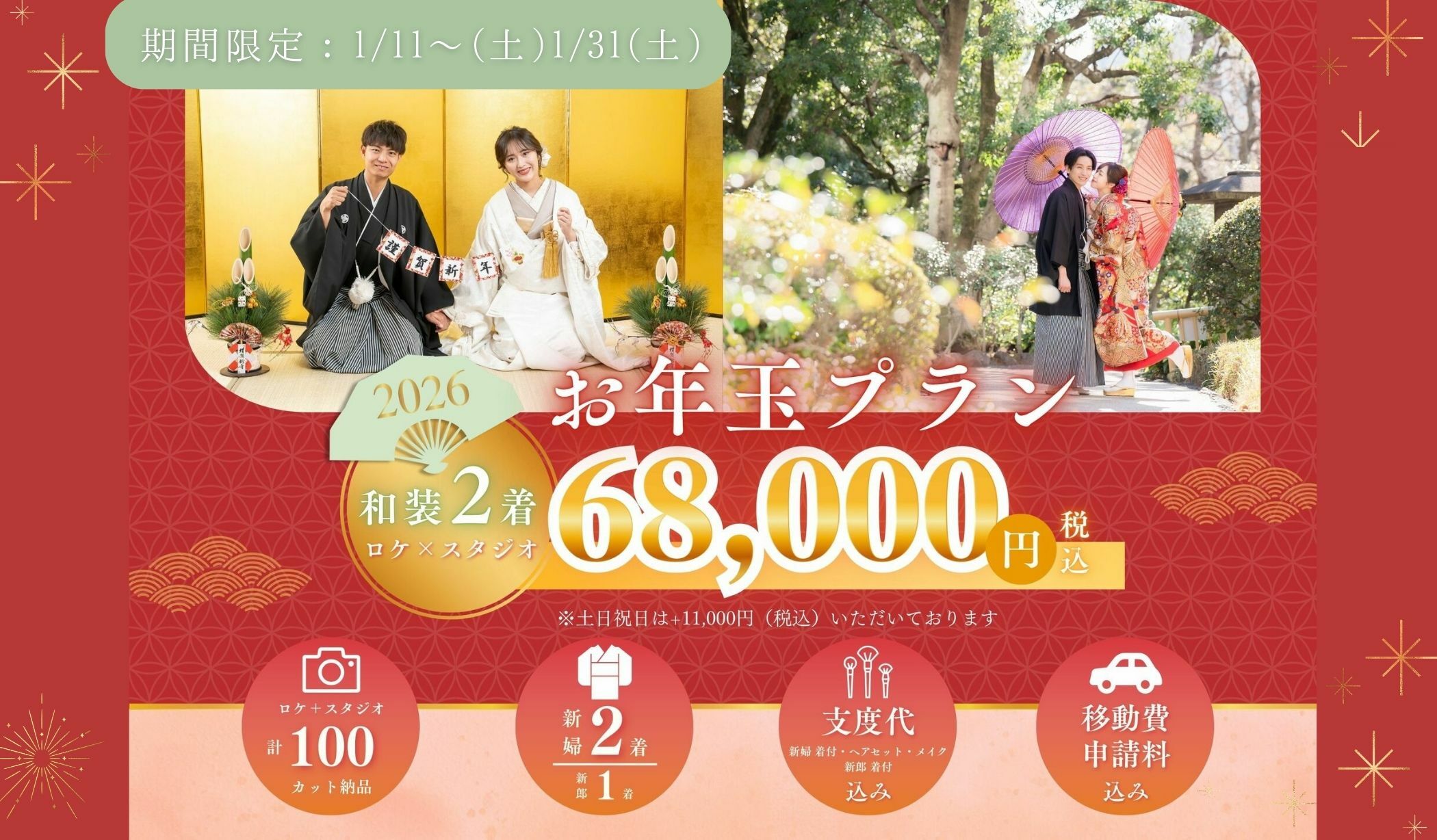 【1/11~1/31の撮影限定!】選べる特典付き!ロケ×スタ和装弐点プランが税込68,000円♪ 撮影データ100枚✨