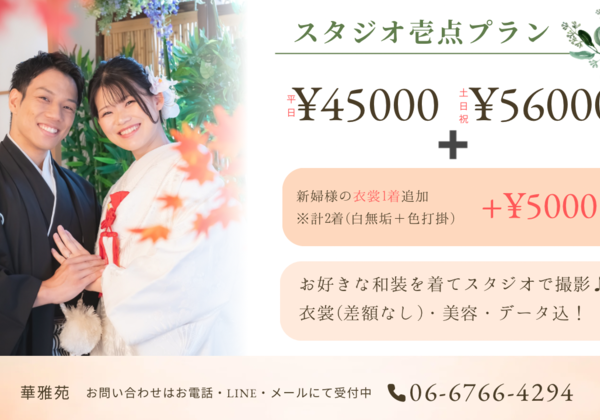 お好きな和装を2着着てスタジオ撮影プラン♪ 華雅苑大阪店より、2026年からの特別プランのご案内です。お好きな和装を2着選んで、スタジオでしっかり撮影できる充実プラン♪どの衣裳を選んでも差額なし!安心のコミコミ価格です。プラン料金 平日 45,000円(税込)土...