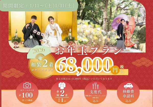 【1/11~1/31の撮影限定!】選べる特典付き!ロケ×スタ和装弐点プランが税込68,000円♪ 撮影データ100枚✨ 期間限定!白アルバムorウェルカムボードプレゼント✨お年玉プラン 68,000円--------------------------------...