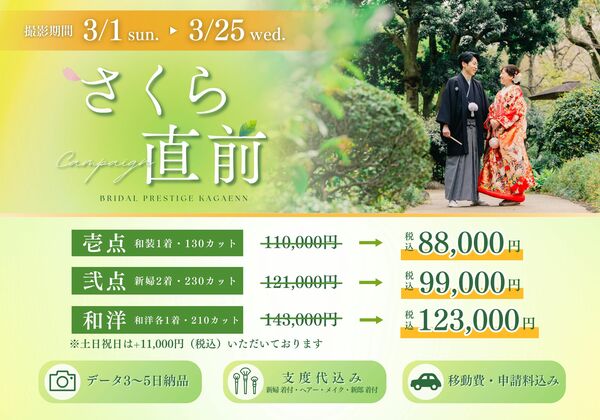【3/25迄の期間限定】直前割キャンペーン さくら直前割キャンペーン-----------------------------------------------撮影期間:3/1~3/25迄参考 どの衣裳も衣裳差額無し 下記の料金が見積です≪壱点プラン≫金 額:...