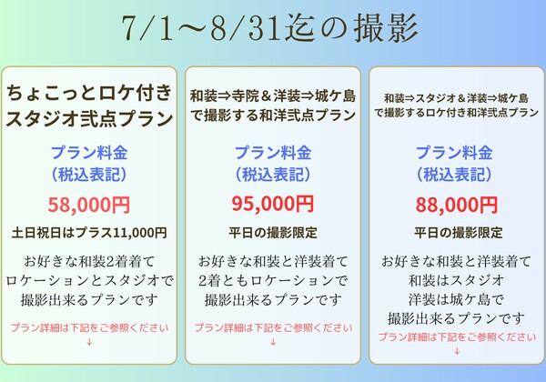 2025年7月1日~2025年8月31日の期間で撮影出来るお勧めプラン♪◇プラン名【ちょこっとロケ付きスタジオ弐点プラン】暑い夏、ちょっとだけロケーションで撮影して、あとは涼しいスタジオで撮影できるプランです♪プラン料金 58,000円(税込)※土日祝日はプラス...