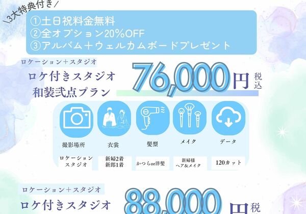 期間限定プランでお得に撮影できるプランを掲載up!! 『スタジオ×ロケ2カ所♪』和装洋装弐点プラン金 額:(税込)93,000円 ※土日祝料金+11,000円内 容:和装+洋装 新郎新婦各2着撮影場所:スタジオ+ロケーション2カ所~対応ロケーション場所~和装...