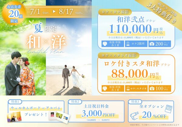 ”3大特典付き!” 夏限定プラン♡ \夏限定和洋(ロケ×ロケ200カット)/-----------------------------------------------金 額:110,000円(税込)内 容:和装+洋装 新郎新婦各1着撮影場所:ロケーション+...