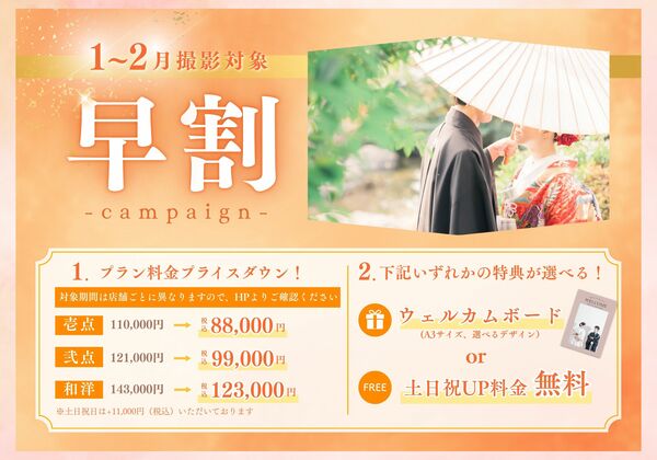 2大特典!早割キャンペーン-----------------------------------------------撮影期間:12/16~2/15特 典 ①:プラン料金プライスダウン!特 典 ②:ウェルカムボードプレゼント or 土日祝日UP料金無料≪壱...