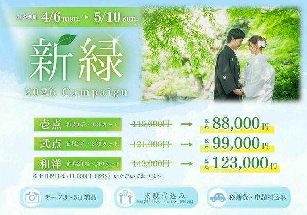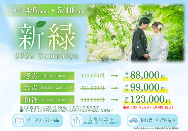 【4/6~5/10撮影限定】新緑キャンペーン 『新緑キャンペーン』-----------------------------------------------横浜店撮影期間:4/6~5/10迄⓵ウェルカムボードA3プレゼント♪②土日祝料金無料♪どの衣裳選んでも衣...