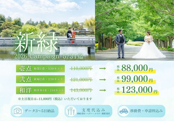 5周年の感謝価格 撮影対象期間 4/1~4/30◆衣裳はどの衣裳を選ばれても差額料金無し!!◆表記の価格がほぼ最終見積です!!対象プラン▼和装スタジオ壱点プラン料金 平日50,000円➡40,000円 (土日祝はプラス11,000円) ・含まれる内容 男性用衣裳...