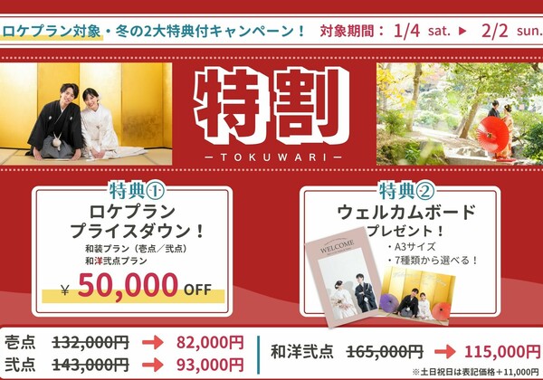 ロケーションプラン5万円OFF+A3ウエルカムボードプレゼント♪特割キャンペーン 2大特典付き!特割キャンペーンのご案内です✨★撮影対象期間:2025年1月4日~2月2日まで★特典1--------------------------和装ロケプラン50,000円OFF...