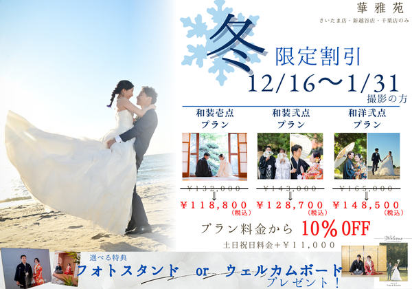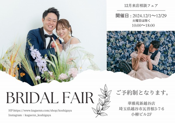----------------------------------------個別撮影相談会開催場所・・・・・・・新越谷店開催日・・・・・12月の火曜日を除く10:00~18:00所要時間・・・約30分~1時間内容・・・・・・・プランのご相談/撮影予約など----...