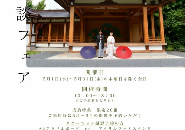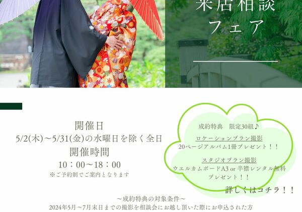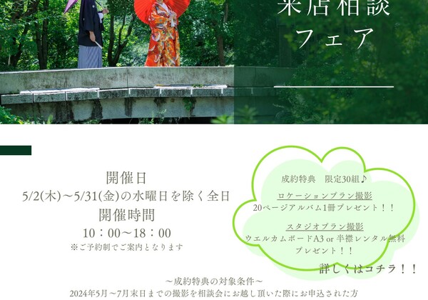5月特典付き来店相談会 『インターネットで調べたけど、来店して直接話を聞いてみたい』『資料を取り寄せてみたけど、お店に相談や確認をしてから予約しようかな』など、是非、お気軽にお問い合わせください♬イベントでは✿ プランの詳細のご案内✿ ロケ先・スタジオ写真のご案内✿ ...