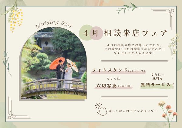 【4月】ご相談来店フェア❀成約特典は2つのプレゼント! 千葉店では水曜日を除く毎日『ご相談来店フェア』を行っております!4月中にご相談来店としてお越し頂きその場で4~5月の撮影予約をすると…選べるプレゼントがもらえます!プレゼント①フォトスタンド(2Lサイズ)また...