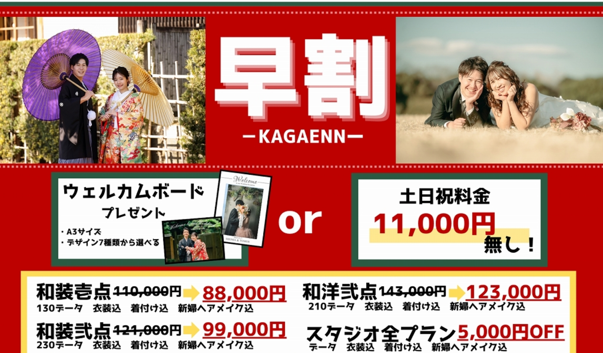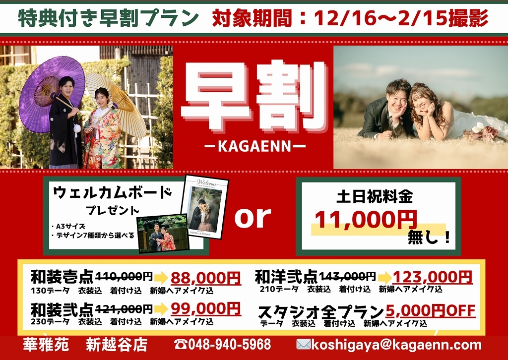 和洋弐点プラン・和装壱点プラン・和装弐点プランで選択可能です。 土日祝日は観光客で混雑が予想されますので平日限定とさせて頂きます。