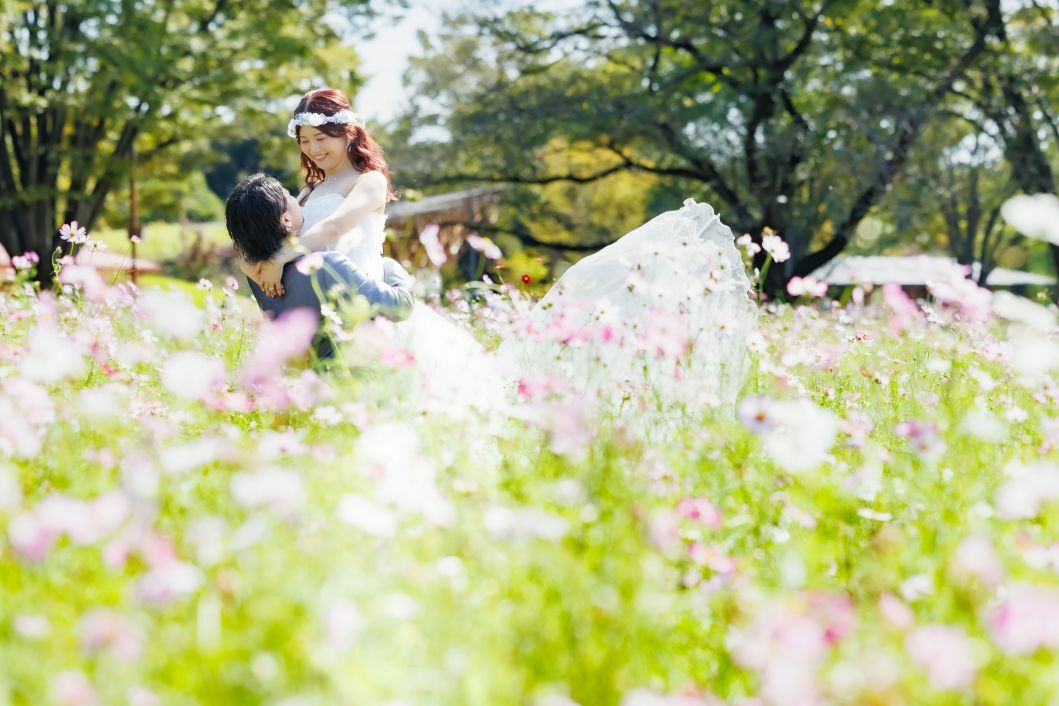 - 園内の日本庭園での撮影や、四季折々の花との撮影が楽しめます。夏はひまわり畑・秋はコスモス・秋は紅葉・新春は梅の花・そして桜・新緑・紫陽花と四季を感じながらの撮影になります。