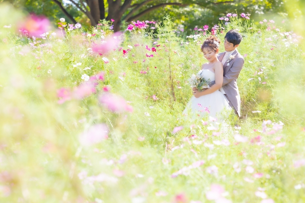 - 10月は『センセーション』と言う花が咲き始めるから薄黄色の中での撮影もおススメ 3種類のピンクのお花に包まれて撮影できます そして今年は昼と夜の寒暖差が大きいので紅葉になるのは早いかも♪ ※和装弐点プランの場合はスタジオとの組み合わせになります