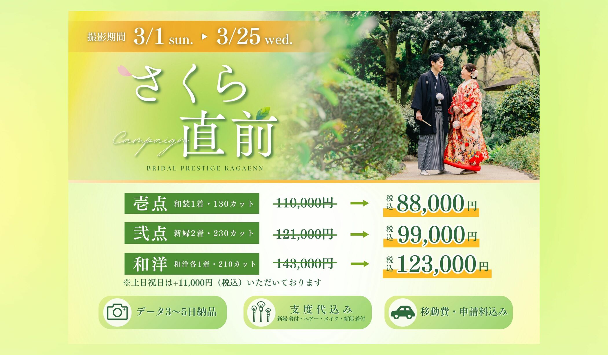 | 3/1〜3/25 | 110,000円 ➡88,000円 (さくら直前割キャンペーン) |