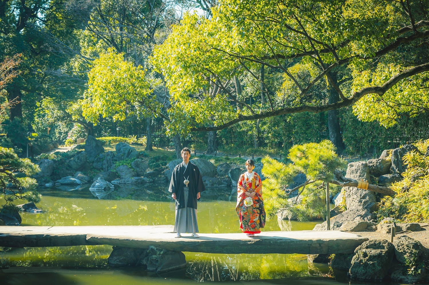 ●新郎 和装×1 ●新婦 和装×2 ●新婦 ヘアメイク ●二人の着付け ●データ230カット ●撮影場所代金込 ●庭園+スタジオで撮影  |