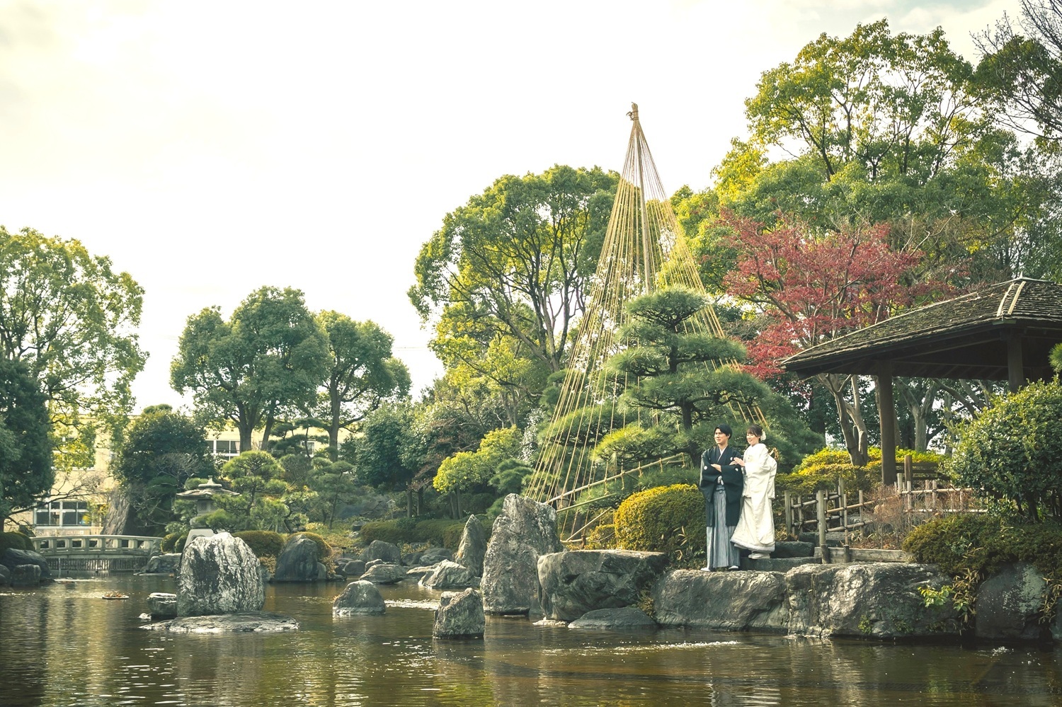 | シーズン | ●新郎 和装×1 ●新婦 和装×1 ●新婦 ヘアメイク ●二人の着付け ●データ130カット ●撮影場所代込 ●庭園  |