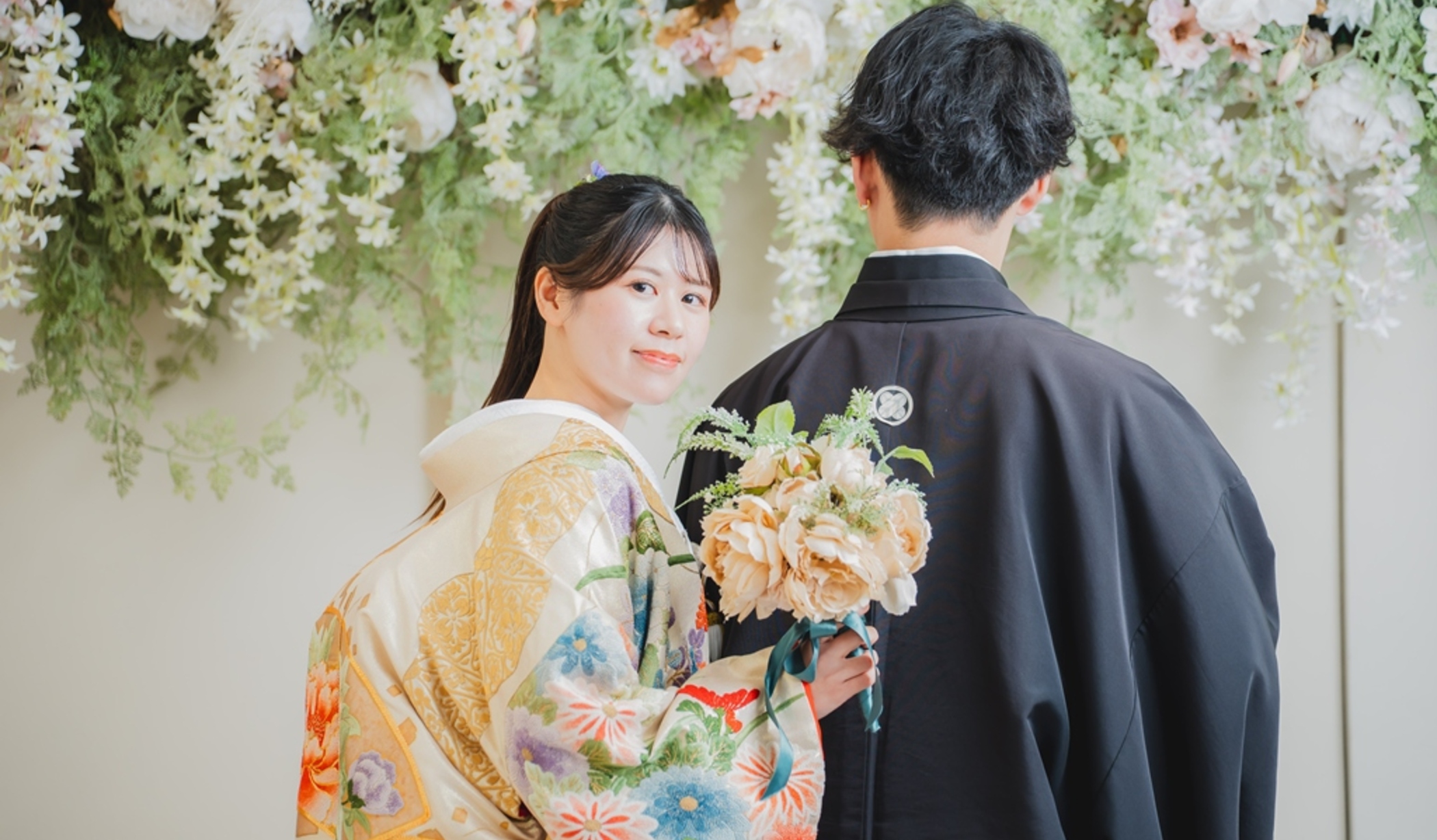 衣裳はプランにより衣裳の選択点数が変わります。白無垢(かつら綿帽子、かつら角隠し、洋髪)、色打掛(かつら角隠し、洋髪)、黒引振袖(かつら角隠し、洋髪)からご選択ください。男性用の紋付羽織袴一式は全プランに含まれます。