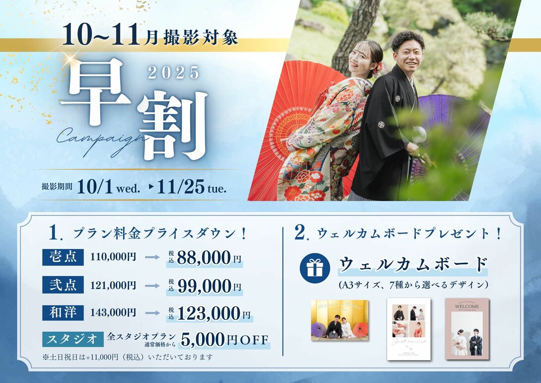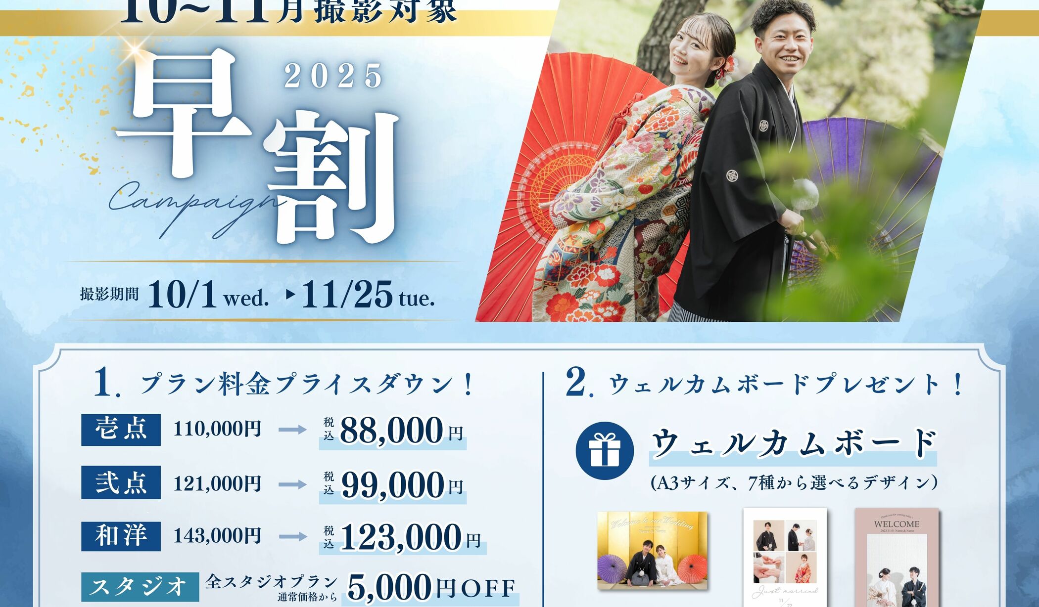 - 10/1~11/25の撮影★最大22,000円オフ 早割キャンペーンのお知らせ