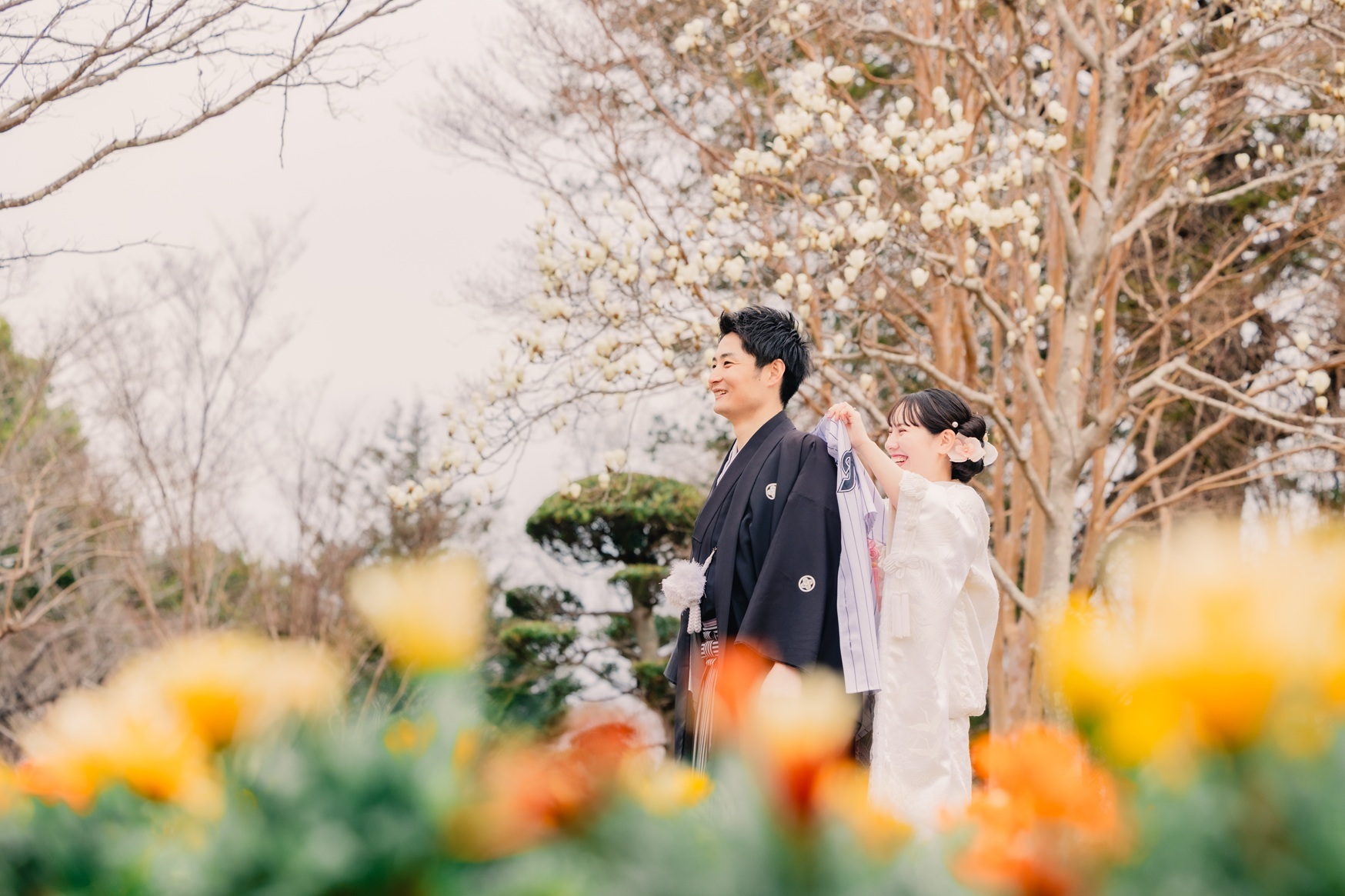 衣裳はプランにより衣裳の選択点数が変わります。白無垢(かつら綿帽子、かつら角隠し、洋髪)、色打掛(かつら角隠し、洋髪)、黒引振袖(かつら角隠し、洋髪)からご選択ください。男性用の紋付羽織袴一式は全プランに含まれます。