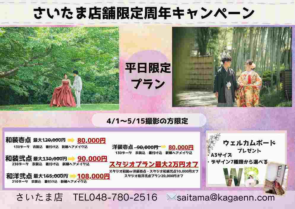 | ≪和装壱点プラン≫ ・花田苑 ・難波田城公園 ・川越街並み ・大宮第二公園 ・権現堂 ・旧石川組製糸西洋館 上記から1か所ロケーション先をお選び頂けます ※旧石川組製紙西洋館は 申請料10,000円(税込)いただいております。 |